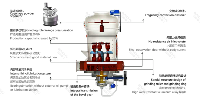 2.研磨粉碎??:磨腔內,磨輥在離心力作用下緊壓磨環(huán),物料在磨輥與磨環(huán)之間受到碾壓、沖擊、剪切作用被粉碎。